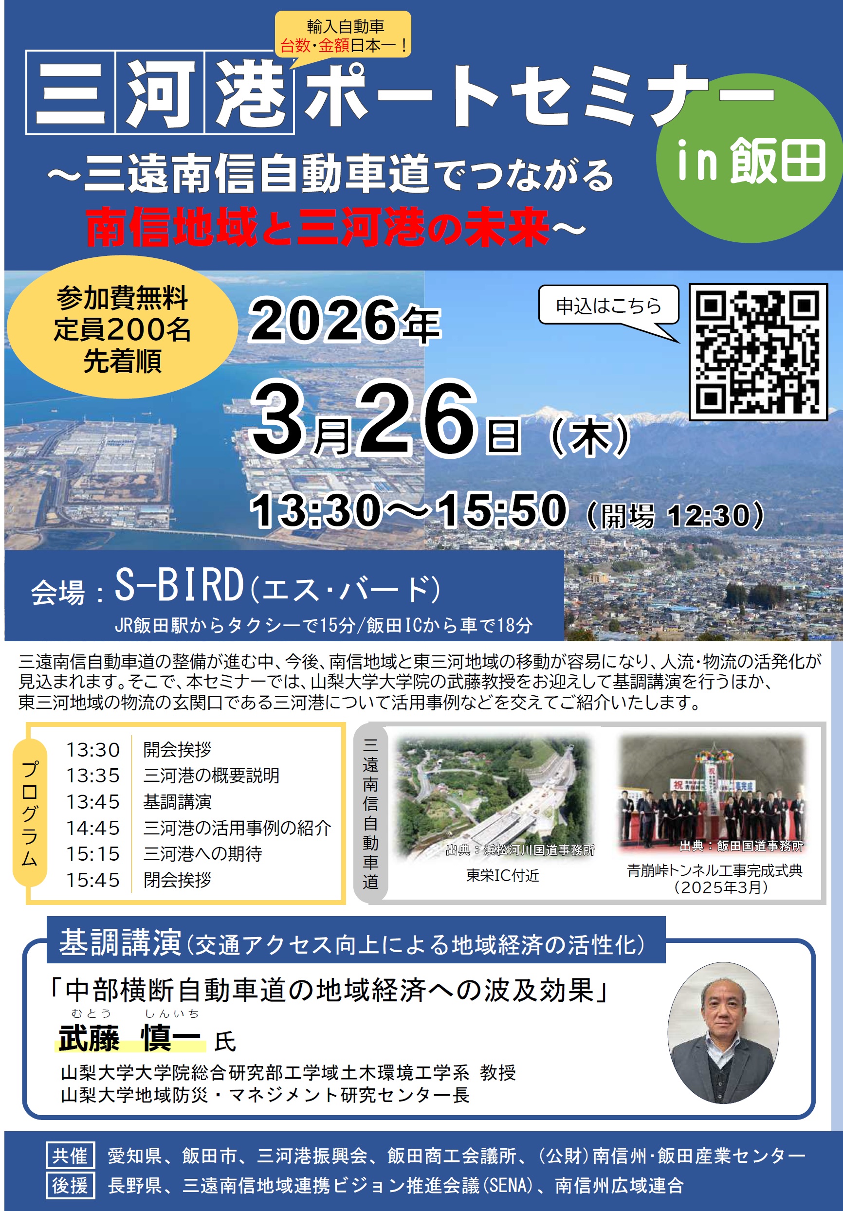 By 飯田商工会議所 投稿日: 2026年2月2日 カテゴリ: イベント, 三遠南信関連, 講習会 【3月26日開催】三河港ポートセミナーin飯田のご案内2026-02-022026-03-04https://www.iidacci.or.jp/wp/wp-content/uploads/logo_iidacci.png飯田商工会議所https://www.iidacci.or.jp/wp/wp-content/uploads/20260326.jpg200px200px 三遠南信自動車道の整備が進む中、今後、南信地域と東三河地域の移動が容易になり、人流・物流の活発化が見込まれます。そこで、本セミナーでは、山梨大学大学院の武藤教授をお迎えして基調講演を行うほか、東三河地域の物流の玄関口である三河港について活用事例などを交えてご紹介いたします。 詳細:愛知県HP(外部リンク) 詳細:三河港振興会HP(外部リンク) 関連情報景気動向調査結果(令和8年1月分)をお知らせします【3月1日更新】各種補助金・助成金のご案内☆飯田グルメガイド”うまいいだ” 新着情報を更新しました☆飯田グルメガイド”うまいいだ”新着情報 更新しました。