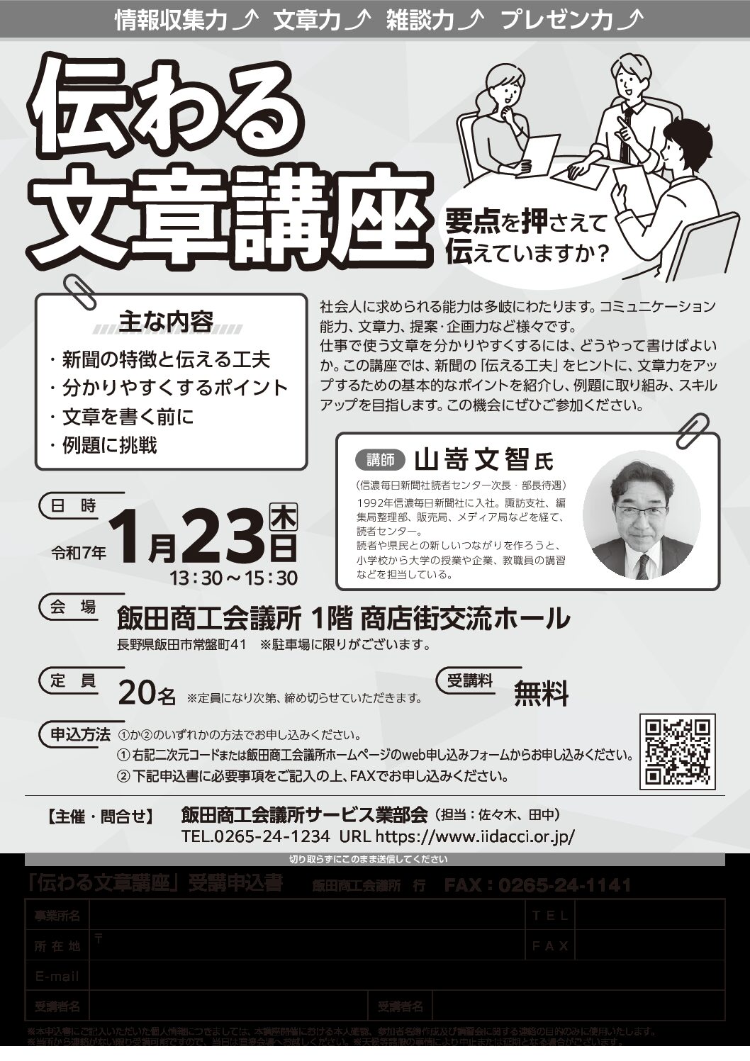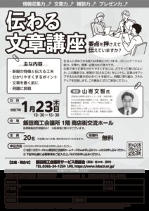 By 飯田商工会議所 投稿日: 2024年12月6日 カテゴリ: r70123_tutawarubunshou2024-12-062024-12-06https://www.iidacci.or.jp/wp/wp-content/uploads/logo_iidacci.png飯田商工会議所https://www.iidacci.or.jp/wp/wp-content/uploads/logo_iidacci.png200px200px 関連情報「中馬ぬくもり街道ひな祭り」が始まります。【3月6日開催】飯田産業技術大学 水素利活用理解促進セミナーのご案内【2月27日開催】経営安定セミナーのご案内【2月20日開催】「訪日観光客おもてなしセミナー」のご案内
